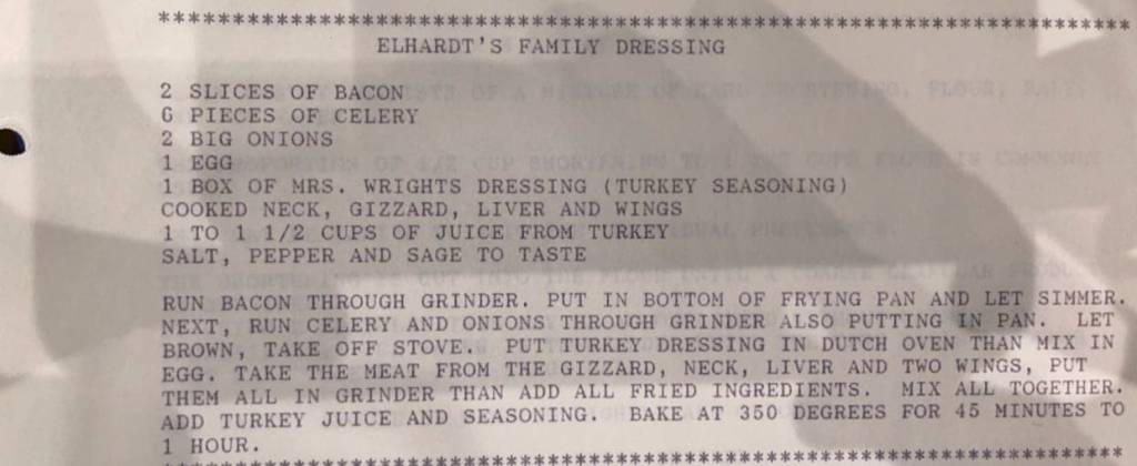 Dad would be allowed in her kitchen once again during the preparation of the “dressing” (another name for stuffing) which became his job. I’m not sure who created the recipe for their home made dressing? It may have been Mom’s or Dad’s as he was the cook/Mess Sargent in the Army during WW2 and then again, they may have created it together. The dressing was made after the Turkey came out of the oven. Dad would add the celery and onions that baked alongside the Turkey as well as including the meat off of the neck and other parts. Fresh ingredients would be added as well. On the end of the pull-out cutting board he would attach the oh so modern and very helpful grinder, which was turned by hand. Many Thanksgiving I would be lucky enough to add some of the ingredients or turn the handle and watch all the food go down the opening. I always was fascinated when he would add fresh celery stocks including leaves and all. Oh, how I loved that job. When everything that was include successfully ground it would be put into a frying pan and cooked until the ingredients were sauteed. It would then be added to either bread that mom had kept to harden or sometimes, we would use the good old standby Mrs. Wright’s Dressing Turkey Seasoning which was later changed to Mrs. Cubbison’s classic dressing seasoned cubes. Then the Turkey drippings was added. Mom would place it in the oven to cook. We knew when it came to that stage, dinner was coming soon.